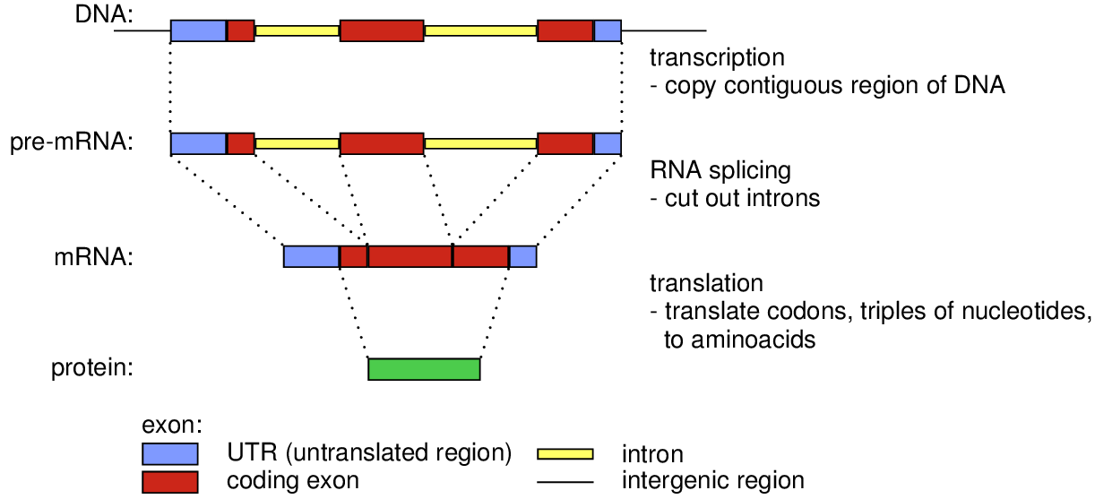 - Recall the Central dogma of molecular biology: the flow of genetic information from DNA to RNA to protein (gene expression)