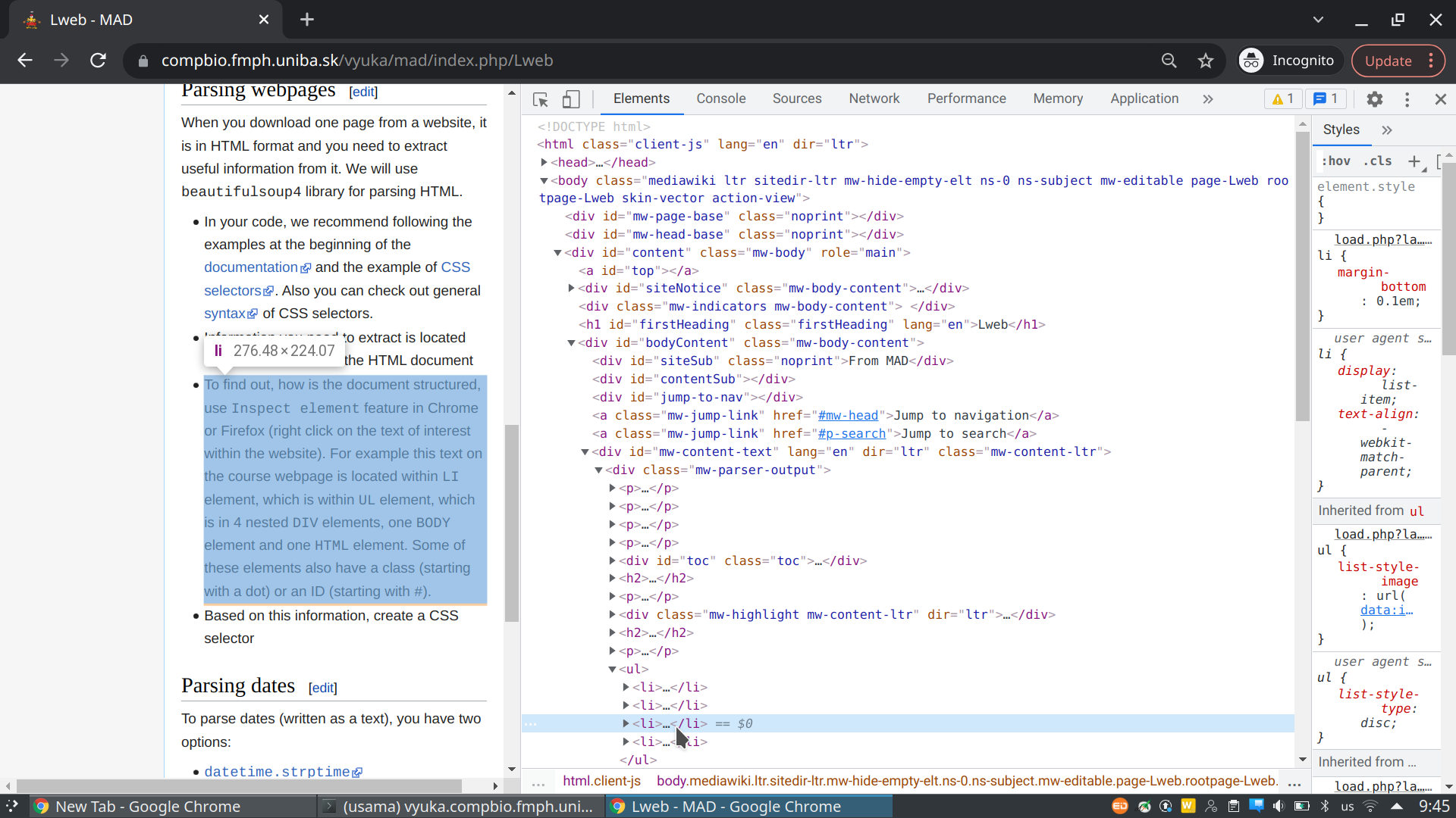 Inspect elementfeature in Chrome or Firefox (right click on the text of interest within the website). For example this text on the course webpage is located withinLIelement, which is withinULelement, which is in 4 nestedDIVelements, oneBODYelement and oneHTMLelement. Some of these elements also have a class (starting with a dot) or an ID (starting with#).